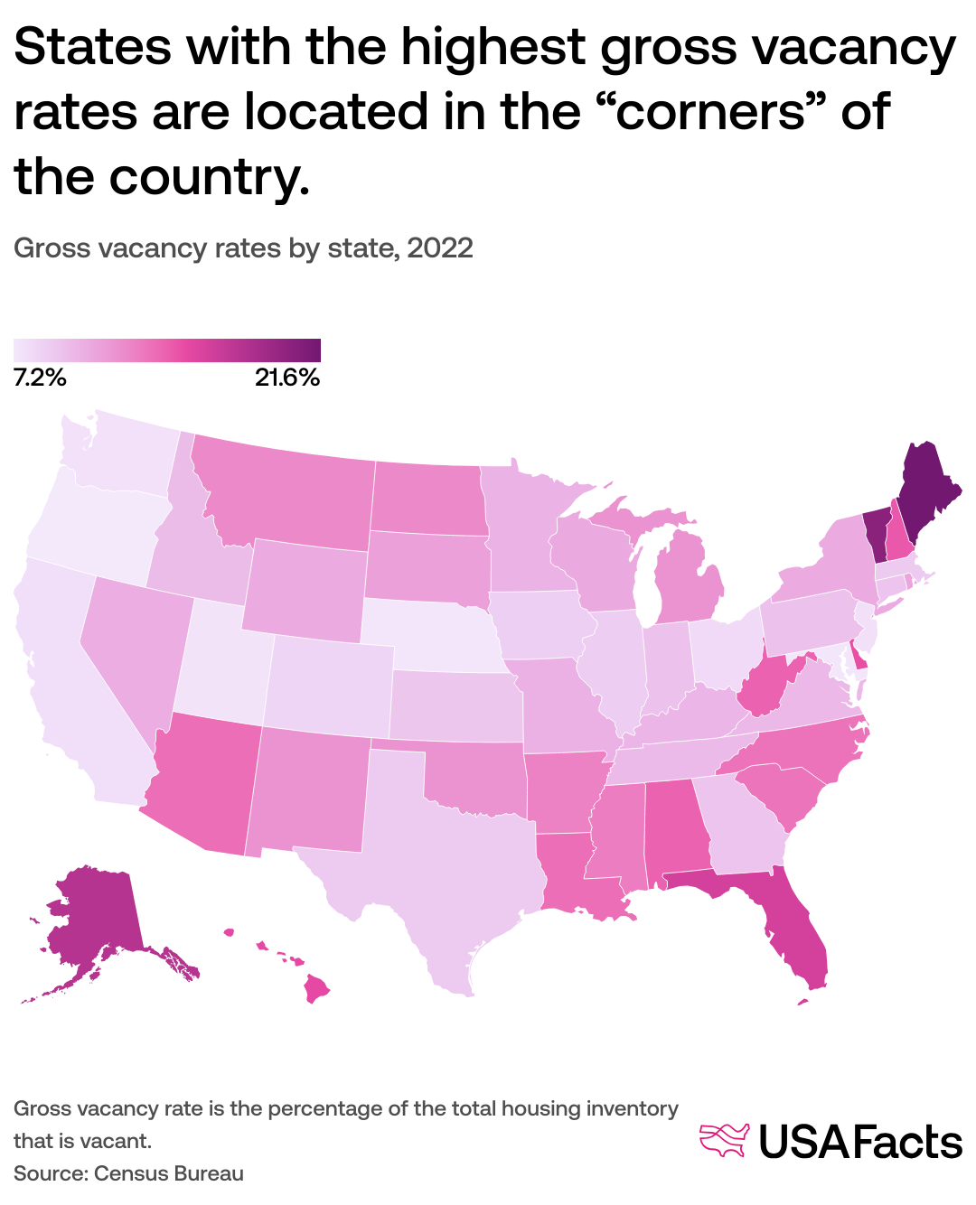 However, since gross vacancy rate is a measure of all vacant properties — including vacation properties — states with several popular tourist destinations, like Florida and Hawaii, will always register slightly higher rates. The Census Bureau notes that the largest category of vacant housing in the United States is classified as “seasonal, recreational, or occasional use.” In over one-fifth of US counties, these seasonal units made up at least 50% of the vacant housing stock.