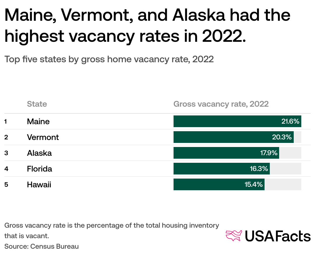 In 2022, the states with the highest gross vacancy rates were Maine, Vermont, and Alaska. Notably, Maine has recorded the highest gross vacancy rate in the nation for 11 of the past 12 years.