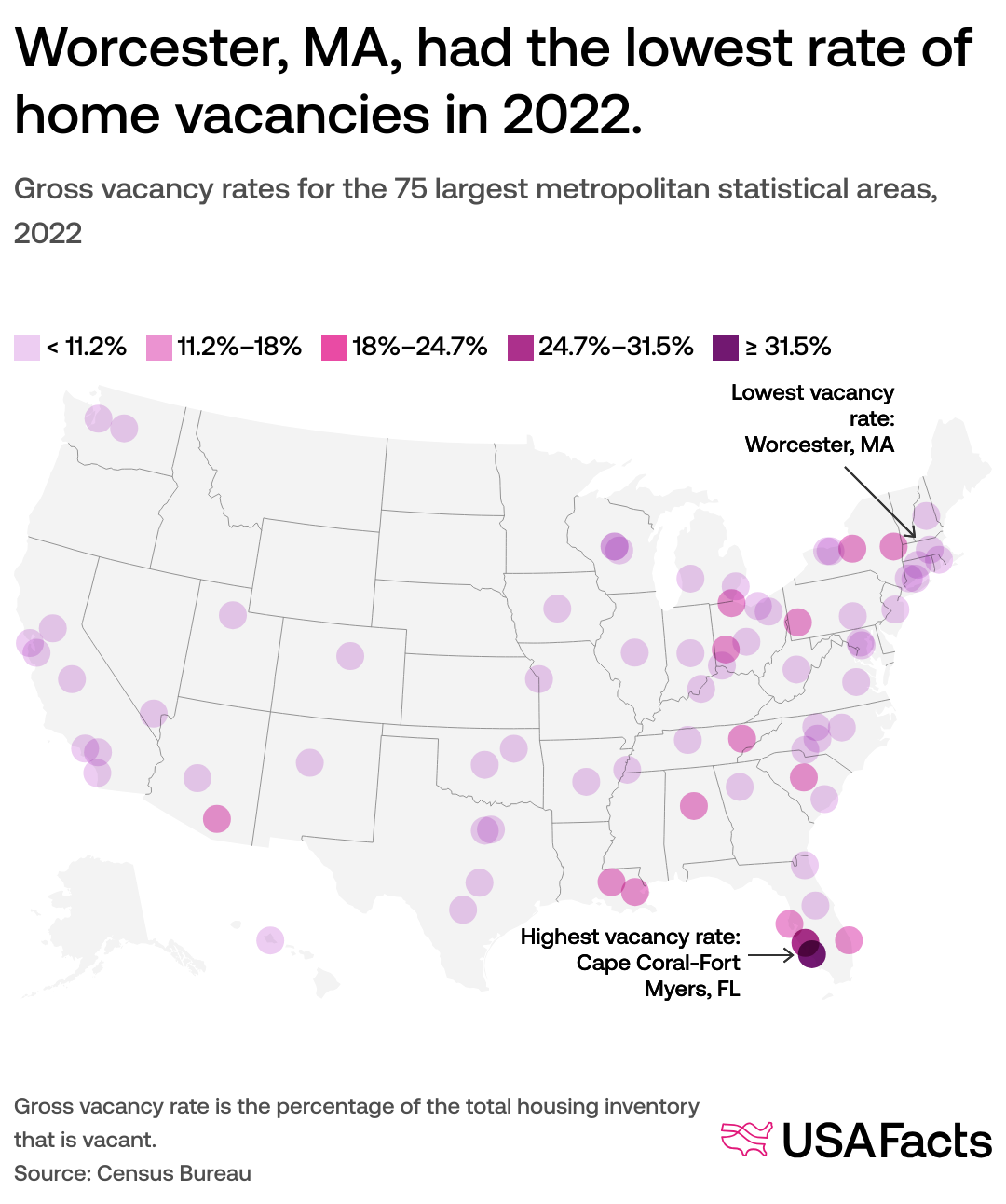 Across the country, the rate of vacant homes ranged from 4.5% in Worcester, MA, to 38.2% in Cape Coral-Fort Myers, FL.